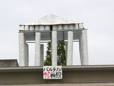 優勝は受付担当の2年4組、大きなレゴブロックで受付ゲートを作りました。屋上にはパルテノン神殿が見えています。 | |