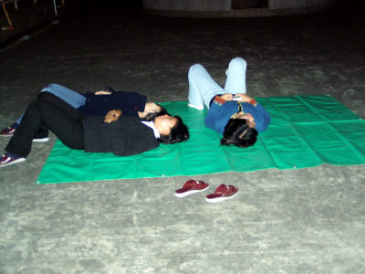 | 何してるって、空を見るにはこの姿勢が一番楽なんです | 普段は立ち入り禁止の屋上で観測、新型の反射望遠鏡もなかなか好調 |