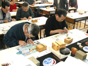 11月30日(火)、本校書道室にて「世界・人・未来」へ発信する学校づくり推進事業の第3回目として篆刻教室を開催しました。篆刻とは印づくりのことです。季節柄、年賀状むきの印を31名の参加者の方に作成していただきました。