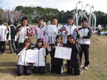 2月12日、市内県立大会各競技の最後を飾る駅伝大会が庄内緑地公園で行われました。本校は男女ともに故障者が出て苦しい布陣となりましたが、粘りが身上の男子チームは、終始5位あたりをキープ、最終走者で一人抜き去り、4位入賞。女子はバスケットボール部から力強い助っ人を得て、5位入賞を果たしました。
