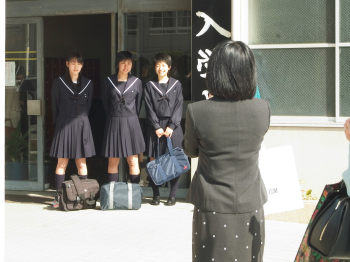 | 厳かな雰囲気の入学式 | 玄関前で記念撮影 |