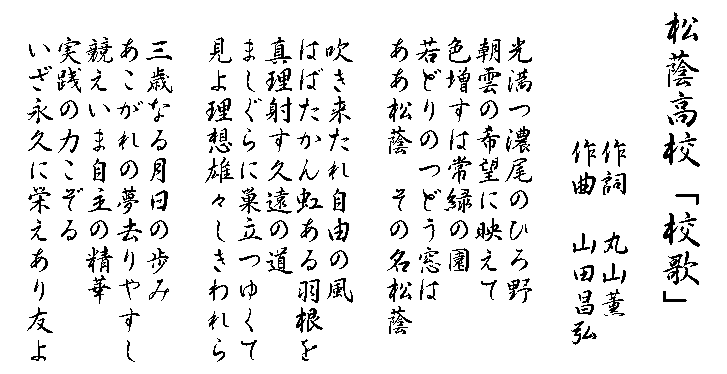 白雲先生は、今年度、本校から旭丘高校に転勤された国語・書道の先生で、本校の卒業生でもあります。かねてより校歌額作成の意向を示され、このほど完成したため、学校に寄贈していただきました。末永く松蔭高校を見守ってくれるでしょう。