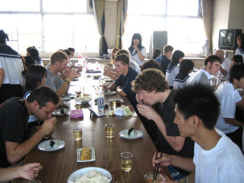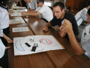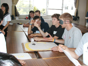 ESS部主催のウェルカムパーティでは、お互い自己紹介や学校の紹介などを行い、福笑いなどのゲームを楽しみました。ジョークの好きなカモーソンチーム、福笑いのゲームのときに、わざと台紙を90度転換させて、ユニークな顔立ちを作らせていました。日頃の私たちでは思いつかないジョークでした。