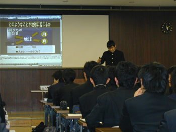 1月30日(月)には、愛知産業貿易館で、最後を締めくくる「探検講座発表会」があり,本校1年生の犬飼翔太君(「宇宙を学ぶ」に参加)が、『もしも月を2つ作ったら』という研究テーマで発表しました。