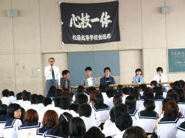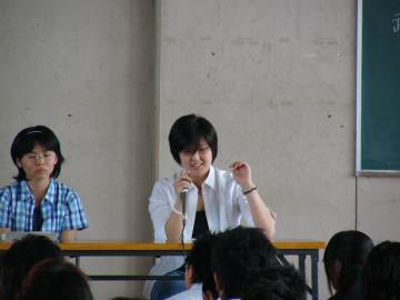 | 学校長が4人の卒業生を紹介しています。 | 卒業生は控え目ながらも後輩に役立つようにと自分の経験を語ってくれました。 |