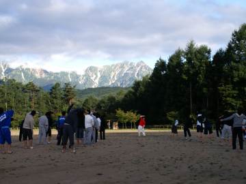 | 食事とおやつの時間は一息つけます | 鹿島槍ヶ岳を見て朝の体操、清々しい! |