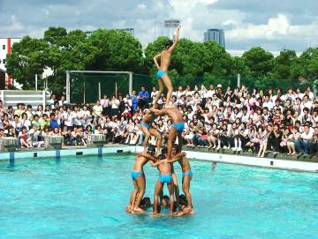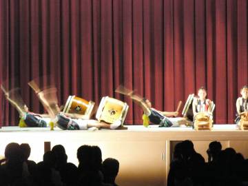 | 男子シンクロナイズドスイミング「松泳ボーイズ」の演技は今年も大好評でした。4段が決まった瞬間! | 和太鼓部の躍動感あふれる演奏が体育館に鳴り響き、文化祭を盛り上げました。 |