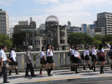 | 原爆ドームの横を通って平和公園へ | 被爆者の体験講話を聴く |