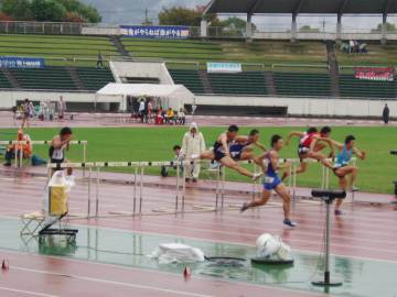 | 110mハードル 表彰式(右から2人目が佐藤君) | 1500m予選 先頭を走る石田君 |