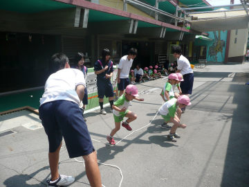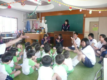 園児のリクエストにあわせて、ピアノを弾き、みんなで歌を歌ったり、紙芝居、縄跳びや、かけっこなど生徒主体で取り組みます。紙芝居を読み聞かせをするのも、保育の立場になると非常に難しく体験を通じてコミュニケーションのとり方を学ぶようです。