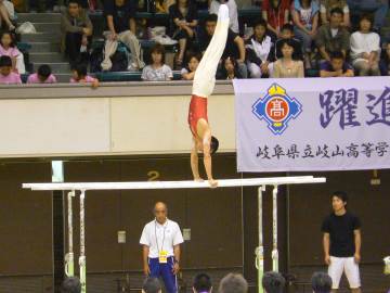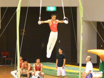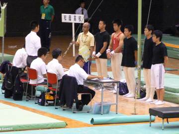 大会1日目は規定演技を行いました。吊り輪→跳馬→平行棒→鉄棒→床→鞍馬の順に演技し、1班の4チーム中2位の成績で、2班の演技を見守りました。2班は各県の第1代表で、全国でも入賞する実力を持った学校だけあってミスのない演技が続きました。1日目を終えた段階で松蔭高校は6位につけていました。