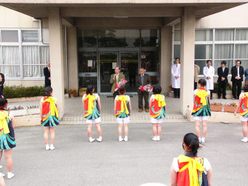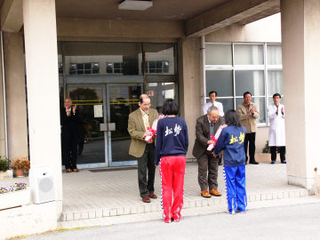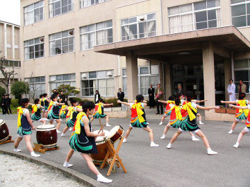 3月31日、退職される先生方を送る会が行われました。各部活動の有志生徒および職員が玄関前に集合し、今年度で定年退職されるお二人の先生を和太鼓部の心のこもった演奏で見送りました。