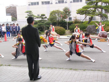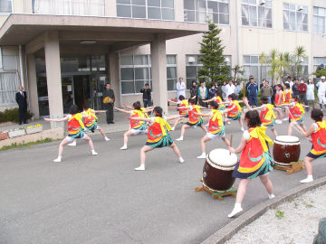 3月31日、退職される先生を送る会が行われました。各部活動の有志生徒および職員が玄関前に集合し、今年度で定年退職される先生を和太鼓部の十八番「南中ソーラン」で見送りました。