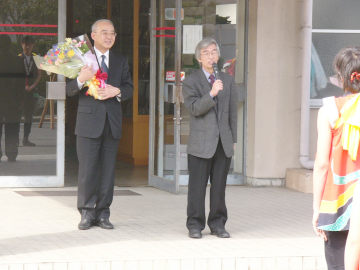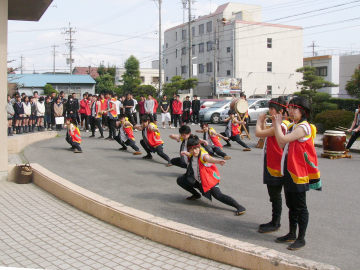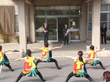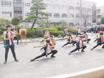 3月30日、退職される先生を送る会が行われました。各部活動の有志生徒および職員が玄関前に集合し、中島校長はじめ今年度で定年退職される先生を和太鼓部の十八番「南中ソーラン」で見送りました。