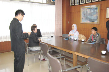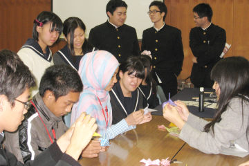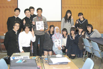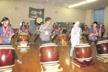 授業後は本校のJRC部員が活動状況を発表し、一緒に書道、折り紙をして交流を図りました。また、和太鼓部の演奏を参観後、一緒に和太鼓を試し打ちしました。日本の文化に触れ、楽しい時間を過ごせたようです。