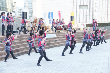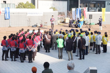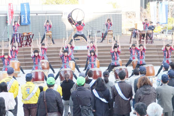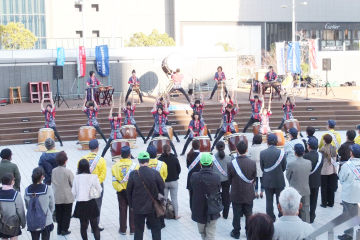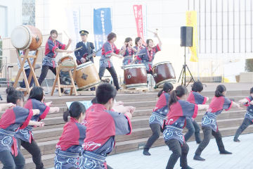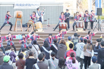 3月15日、名駅のタワーズガーデンで行われた非行防止キャンペーンに、松蔭高校和太鼓部は参加しました。和太鼓部部長の今枝君の非行防止宣言のあと、和太鼓部の演奏、一日署長を務めた津軽三味線奏者の山口晃司さんの演奏と続き、最後は本校十八番の「南中ソーラン」を三味線とのコラボで演奏。