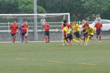 雨が降り出した後半、何度かチャンスを迎えるものの得点は奪えず時計は後半40分、終了間際のセットプレイからとうとう名古屋高校に先制される。ロスタイム表示は3分。刻々と時間は過ぎ審判が終了のホイッスルを手にしたその時、右サイドからのクロスに合わせて劇的な同点ゴール!松蔭応援団からは歓声が、名古屋応援団からはため息が上がる。