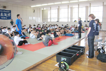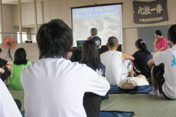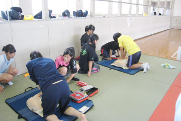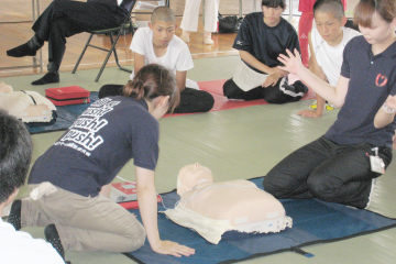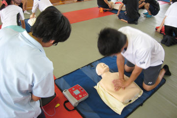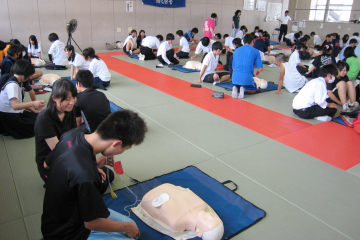 参加生徒は蒸し暑い中、真剣に講演を聴き、熱心に実習に取り組みました。部活動の代表生徒だけあり、上手に胸骨圧迫をしていました。実習を通して技術を身に付けたと思います。