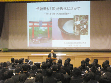 講師として本校第17回卒業生で、佐藤喜代松商店代表取締役 佐藤 豊氏をお迎えし「伝統素材「漆」を現代に活かす」という演題で講演をしていただきました。