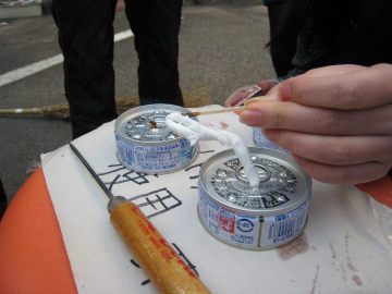 ツナ缶ランプの作成は、非常食として利用されるであろうツナ缶の油分に着目し、食する前にその油を利用してランプの燃料として使ったあと(1缶およそ1時間ほど灯る)に残ったツナを食しました。ツナ缶を有効に利用する試みとして実施しました。