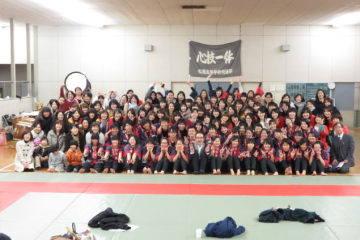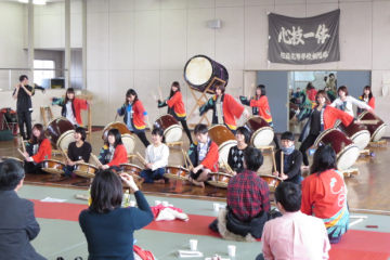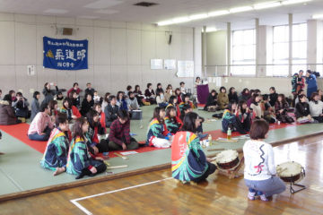 1月12日本校武道場3Fにて「松蔭高校和太鼓部創部25周年を祝う会」が80名を超える大勢の卒業生のご参加を頂き、開催されました。我が部の同窓会の発足に向けて準備委員会の委員長として二代目部長の野村さんが承認され、いよいよ部員と卒業生の交流演奏に。