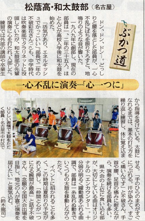 中日新聞の県内版にて連載されている「ぶかつ道」のコーナーに、わが松蔭高校和太鼓部の活動の様子が、掲載されました。6月24日の朝刊です。お揃いの部活のポロシャツで真摯に太鼓に向かう姿の画像と現部長の不破さんのインタビューが載っています。一度ご覧下さい。