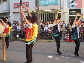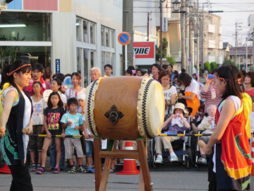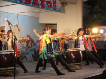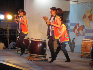 7月26日(土)に、中川金魚まつりにお招き頂き、演奏して来ました。6時からのオープニングセレモニーでは、毎年恒例ながら、交差点のど真ん中で大勢のお客様の見守る中「呼び込み太鼓」の演奏。続いて公園内のステージにて、「うすずみ」他の伝統的な太鼓を披露しました。