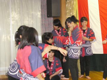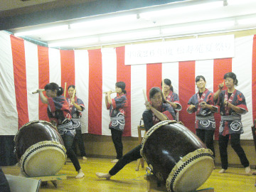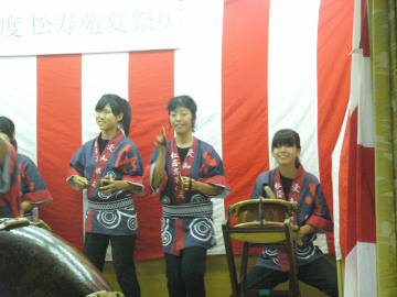 8月2日(土)に、老人ホームの「松寿苑」夏祭りのお招きを受けて、演奏をしてきました。「松寿苑」は、わが松蔭高校和太鼓部が最初に演奏をさせて頂いたご縁の深い施設です。海東流神楽太鼓はじめ3曲披露し、皆さんに喜んで頂きました。演奏後は、焼きそばやフランクフルトなど、食べきれないくらいにご馳走になり、私達も夏祭りの雰囲気を味わうことができました。ありがとうございました。
