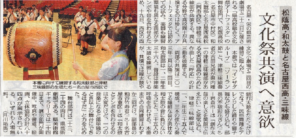 中日新聞の県内版にて明日開催される、松蔭高校和太鼓部と名古屋西高校津軽三味線部との合同練習の様子が、掲載されました。8月19日の朝刊です。一度ご覧下さい。