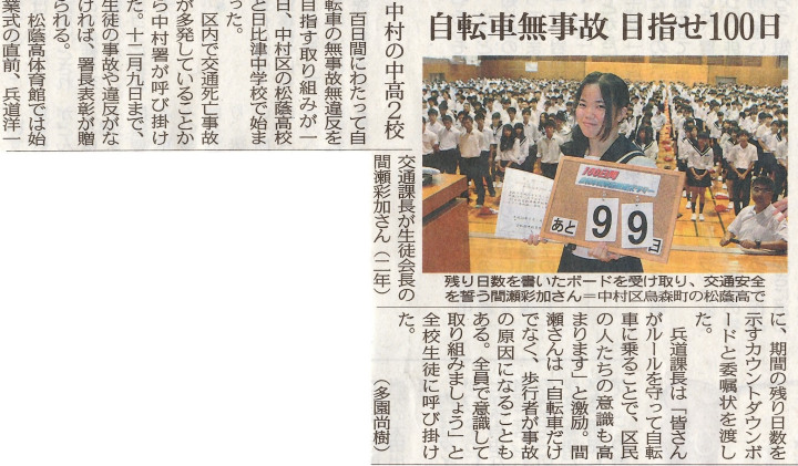 中村警察署の呼びかけに応じて9月1日より「自転車無事故無違反100日ラリー」を始めました。始業式の前に、生地会長が中村警察署の兵藤洋一交通課長様から委嘱状とスタンプシールを貼るダルマの絵の台紙などをいただきました。12月9日までの100日間、シールが途切れることなく貼れて、ダルマの絵に目が入れられるように、松蔭高校全員で、無事故無違反を目指します。