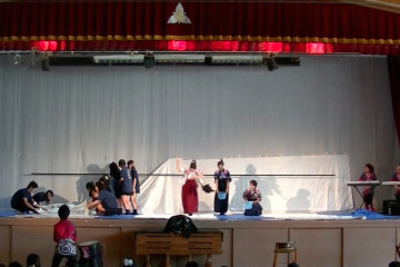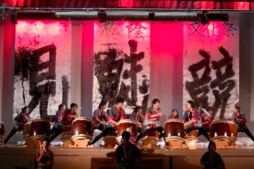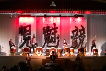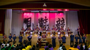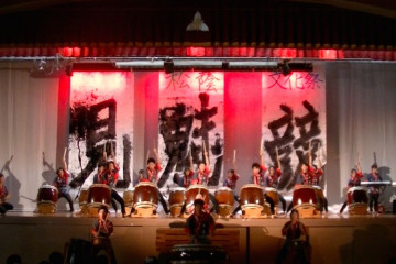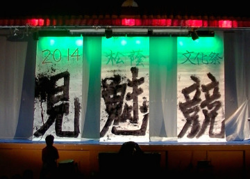 9月12日(金)松蔭高校の文化祭が幕を開けました。ことしのオープニングは書道部と和太鼓部のコラボレーションです。勇壮な太鼓の響きにのせて、2014文化祭のメインテーマ「松蔭文化祭三題 見せる(各々の思いを形にする)、魅せる(来賓の方々の心をつかむ)、身競せる(各々の成果を競う)」を力強く書き上げました。その後は「見、魅、競」の前で、和太鼓部オリジナルのエンカウンターを披露しました。