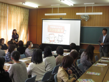 10月15日(水)に1年生保護者対象に「保護者のためのスマホ教室」を実施しました。この講座は、愛知県が「保護者向けスマートフォン安心利用普及事業」として実施している教室です。当日は、約50名の参加があり、スマホを持っていない方も、実際にスマホに触れて、危険性を認識するとともに、正しい使い方や知識を習得することがきました。
