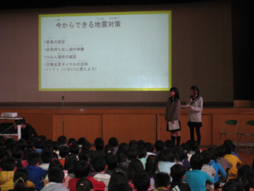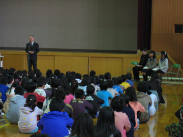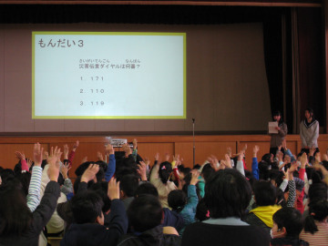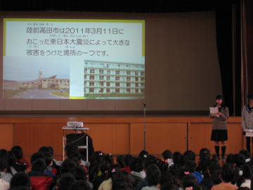 3月9日(月)の朝、柳小学校に、校長先生とJRC部3人が出向き、防災講話をしてきました。 柳小学校の全校朝会を利用して、昨年度より防災講話をしています。 全校児童は静かに、真剣に、3人の話を聞いてくれました。 今回は、陸前高田市訪問の様子を伝え、クイズを出しました。クイズに答える一生懸命な姿がとても可愛らしく、来年度以降の活動の励みになりました。