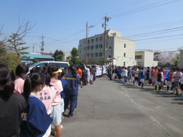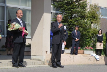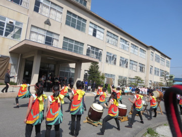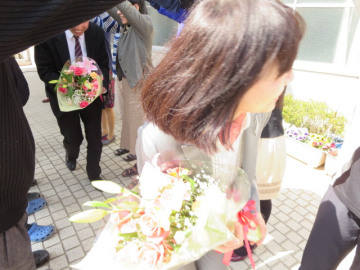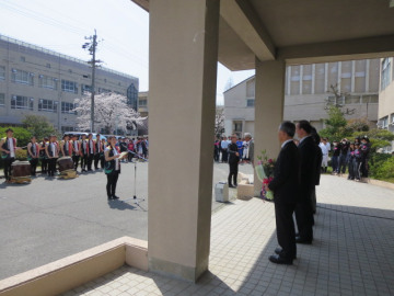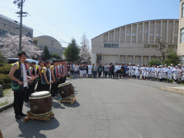松蔭高校では、その辞令交付のあと正面ロータリーにおいて、「退職される先生方を送る会」を毎年行っています。花束贈呈のあと、和太鼓部が先生方の今後のご多幸を祈念して、ソーラン節を披露し、最後に花道を作ってお送りしました。先生方、お疲れ様でした。そして、本当にありがとうございました。