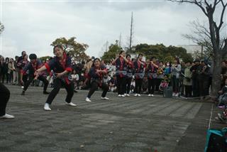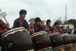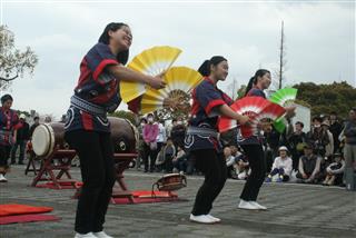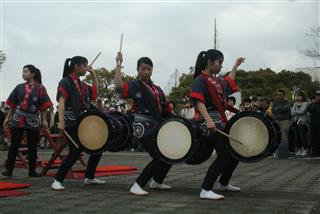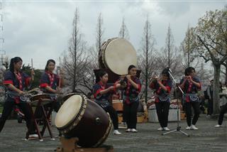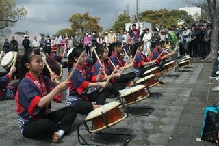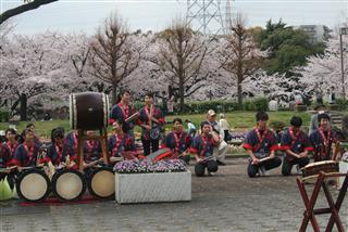 4月3日(日) 松蔭高校和太鼓部は名古屋市港区にある荒子川公園で2回公演。満開の桜の下、大勢の花見客が足を留め、演奏に聴き入った。