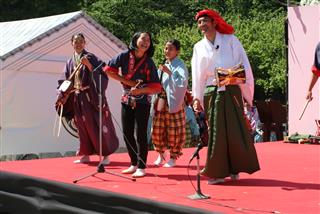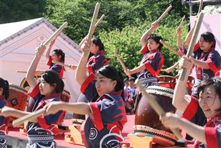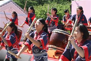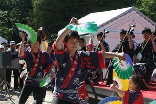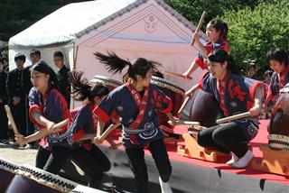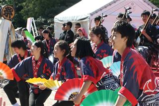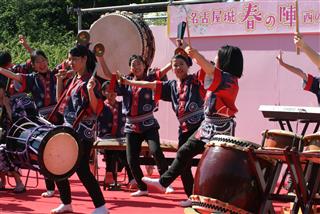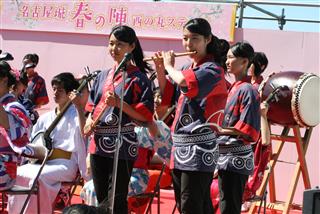 4月29日(祝)、松蔭高校和太鼓部と名古屋西高校津軽三味線部が、名古屋城西の丸ステージで、尾張万歳を受け継ぐ「今枝社中」と共演した。 伝統芸能の交流を目指して企画された初コラボであったが、午前と午後の2回公演で観光客ら約500人の観衆を楽しませた。 特に「エンカウンター」の勇壮な振り付けと迫力ある演奏には、多くの観客が固唾を呑んで聴き入っていた。