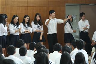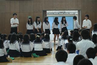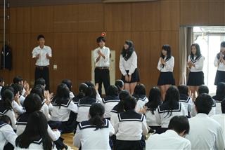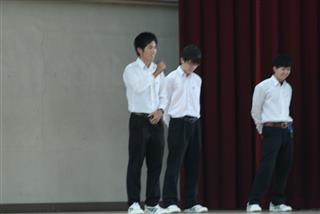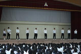 松蔭高校最大の学校行事である体育祭(6月8日予定)に向けて準備が始まった。 5月25日(水)、1学期中間考査終了後、体育館に全校生徒が集合し群団集会が開催された。学年縦割りの9つの群団の組み合わせが発表され、3年生の各群団長がそれぞれ抱負を力強く述べた。