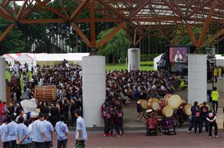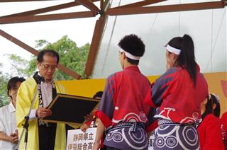 7月30日に、御殿場市富士山交流センターで開催された「富士山太鼓まつり全国高校生太鼓甲子園で、松蔭高校和太鼓部が、見事優秀賞(二位)を受賞しました!2年前のリベンジということで、今回は音の厚みやダイナミズムにこだわりました。その結果野外ホールという音の散り易いステージにもかかわらず、音がビンビン響いてきて、かなりのインパクトがありました。演奏後結果発表。生徒は、最初から賞狙いではなく、『エンカウンターで自分たちなりの結果を出し切りたい」という思いだけですので、かなりのリラックスムード。私は、「特別賞なら、取れるかも?」という密かな期待を持って表彰式を見守りました。特別賞が他校と聞いて、私が「残念」という思っていた矢先、「優秀賞 愛知県立松蔭高校」という呼名が! まさか、優秀賞(二位)が取れるとは夢にも思わなかった生徒は、もう驚きとうれし涙でメイクも取れそうでした。本当にオメデトウ!演奏と表彰式がupされていますので、ご覧下さい。