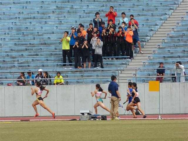 女子1600mリレー3走柴田さんと集団応援する松蔭高校陸上部員