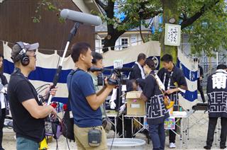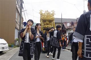 ![]() 曳き回し出発。半纏姿は和太鼓部3年生 |