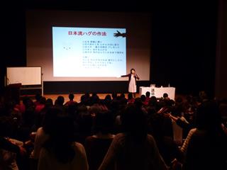 1月19日(金)1時より、中村文化小劇場で、公立学校PTA連合会主催による名南地区研修会が開催されました。名南地区の13校・約260名が参加し、松蔭高校が担当校として運営と進行を行い、株式会社ハグニケーション代表であり、日本ハグ協会会長の高木さと子先生を招き「子どもの生きる力を育む 子育て術」〜子育てに活かすハグニケーション〜の講演をして頂き、コミニュケーションの大切さと、ハグによるコミュニケーション=ハグニケーションによる子育てについてお話し頂きました。