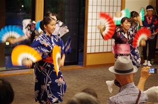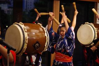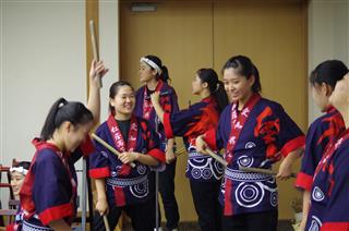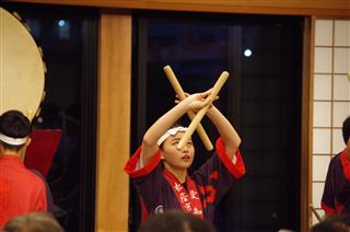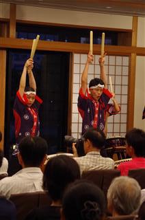 | 続いて夏らしく浴衣姿の「羽子踊り」 | 篠笛の演奏が魅力的な「天平太鼓」 | ||||||||||