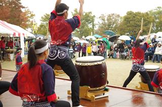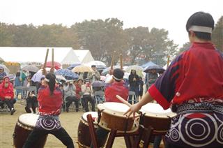 | まずは、1年生「ぶち合わせ」 | 屋台囃子。ステージが濡れて いるので、締め太鼓立ち演奏 |