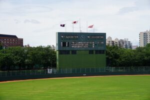 最初は7月5日(日)の予定でしたが、雨のため11日(土)さらに12日(日)と延期になっていました。当日は一週間続いた雨が止み、雲の合間には青空ものぞく、梅雨の晴れ間の良い日でした。3か月の臨時休業とその後の対外試合制限期間を経て、昨秋以来の公式戦です。観客は野球部員及び保護者の方々と本校関係職員限定。検温、手指の消毒をして観客席に入場。さらには密集を避けての観戦、好プレーには拍手で、校歌はなし、などなど。例年とは違う応援風景でしたが、久しぶりに部活動の試合を観戦することができました。試合は序盤大きくリードされました。中盤に粘るも、終盤に追加点を許して3-8で負けました。残念ですが、短い、制限の多い準備期間で練習を重ねて試合に臨んだ選手のみんな、特に3年間の部活動の節目を迎えた3年生のみなさんにエールを送りたいです。お疲れ様でした。名古屋国際高校さん次戦も頑張ってください。