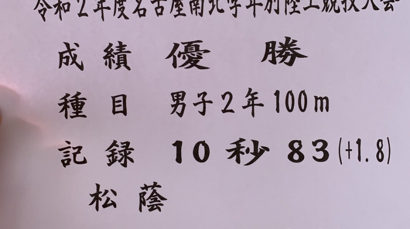 7月23,24日、見出しの大会がパロマ瑞穂スタジアムで行われました。競技場には観戦の制限が設けられて応援もままならないなかでの競技会でしたが、本校2年生の木下凌輔君が2年生男子100mで10秒83(追風1.8m)で見事優勝しました。この記録は、本校では鬼頭正成さん(平成9年)、山田昌邦さん(平成17年)が樹立した松蔭高校記録に並ぶ価値あるものです。また、同じレースで走った岡山知暉君も11秒13の好タイムでそれまでの自己記録(11秒18)を更新しました。