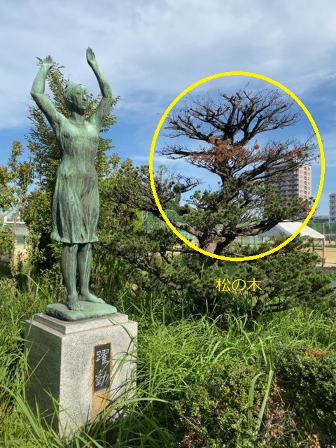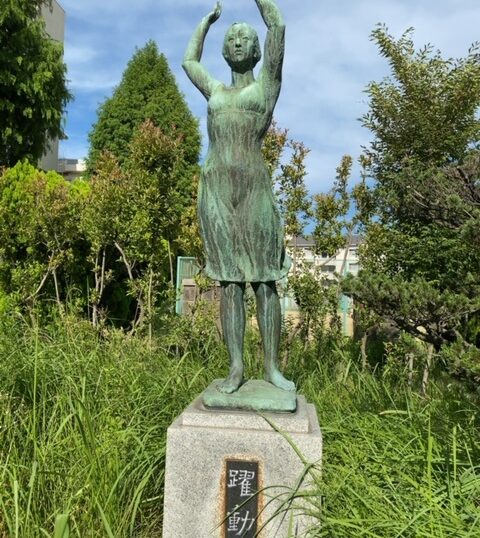 1号館と2号館の間にあるスペースは、文化祭期間であれば、「松蔭ガーデン」と呼ばれるステージとなり、書道部のパフォーマンスや有志グループのダンス、コントなどの出し物で大いに賑わう場所です。松蔭ガーデンの後ろにそびえ立つのが「躍動像」です。1980年(昭和55年)に松蔭高校創立40周年を記念して作成されました。その後、像の隣に松の木が植樹されました。1983・84(昭和58・59)年度と全国高等学校総合体育大会陸上競技女子やり投で2連覇を達成した水野千鶴選手(松蔭37回生)の偉業を称えたものです。躍動像が建てられてから40年を迎えた今年、新型コロナウイルス感染症拡大防止のため80周年記念事業は来年に持ち越されましたが、今も松蔭生を見守ってくれています。