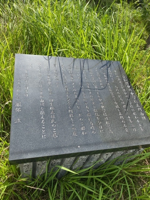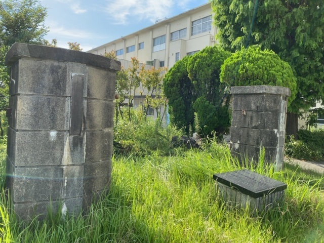 Newsletter Voi.17-No.011で掲載した躍動像の反対側には、松蔭高校の前身である旧制中川中学校の正門門柱が移築されています。中川中学校は1940(昭和15)年に開校しましたが、1945(昭和20)年3月の名古屋空襲で校舎は全焼してしまい、その時に残っていたのがこの門柱でした。当時は現在のグラウンドの手洗い場付近に位置していたものを松蔭高校創立50周年を記念して、移築保存しました。このことは、50周年時に学校長を務めていた当時の服部滋校長が「愛知縣中川中學校正門由緒」として門柱が保存されている場所に碑を残しています。