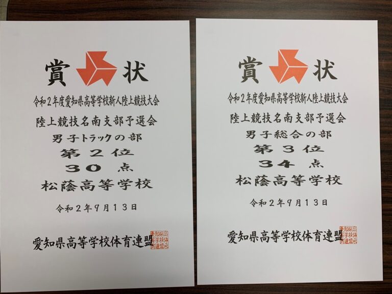 9月5,12,13日、パロマ瑞穂スタジアムで行われた令和2年度愛知県高等学校新人体育大会陸上競技名南支部予選会で、本校陸上部は男子総合第3位の成績を収めることができました。入賞選手は以下のとおりです。