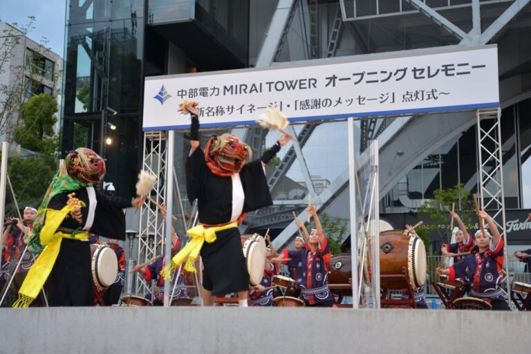 テレビ塔は、2021年5月1日より、中部電力MIRAITOWERと命名変更されました。本校和太鼓部は、その栄えあるセレモニーにお招きいただき、演奏してきました。