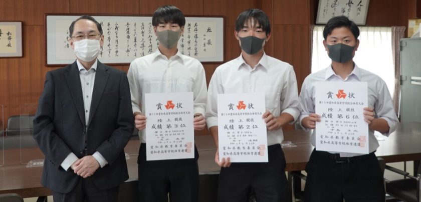 前号、Newsletter Vol.18-No.11 で紹介があった陸上競技の県大会。その結果報告のため入賞を果たした陸上部3名(写真左から、足立選手、木下選手、中島選手)が校長室を訪れてくれました。中間考査直後の大会で、調整やコンディションつくりに苦労したと思いますが、出場したそれぞれが自らの力を発揮してくれました。木下選手(100m及び200m)と足立選手(5000m競歩)は、6月18日~20日に伊勢市の三重県営総合競技場で開催される東海高校総体への出場権を得ています。大会が予定通り開催されることと、そこでのさらなる活躍を期待したいと思います。